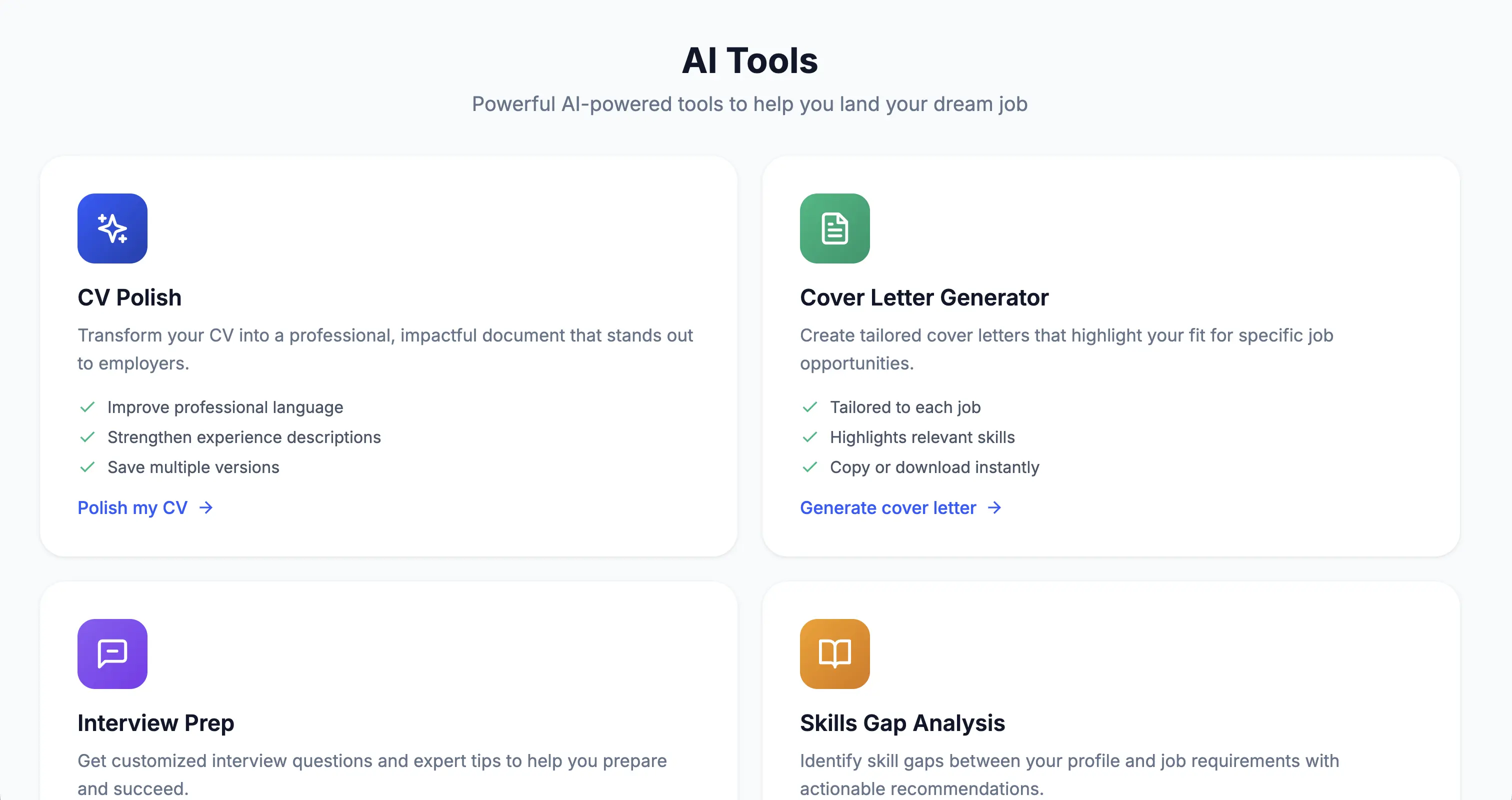 You get four powerful AI tools: CV Polish to improve your resume, Cover Letter Generator to create tailored letters, Interview Prep for custom practice questions, and Skills Gap Analysis to identify areas for improvement.