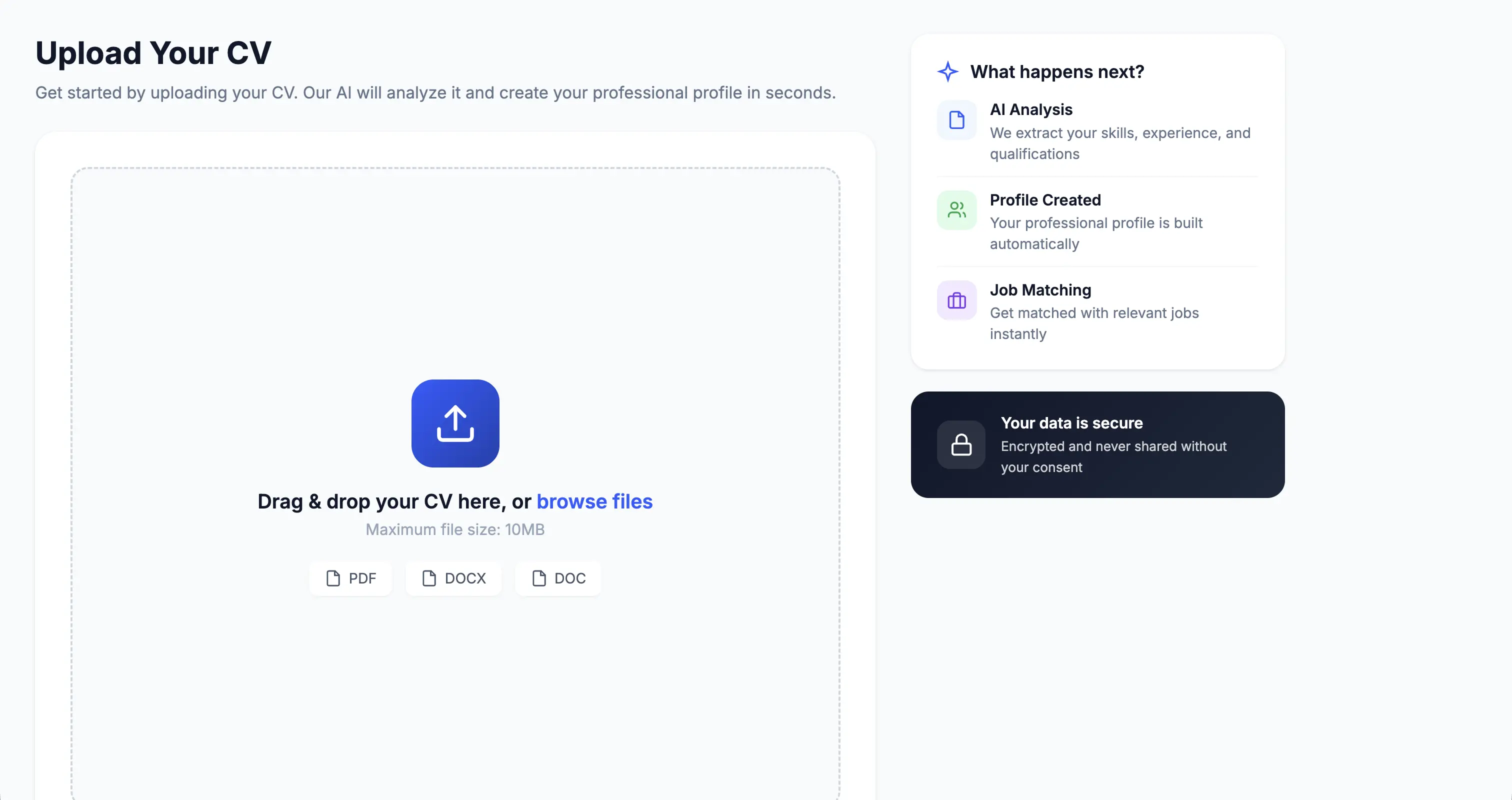 Simply upload your existing CV and create a free account. Our AI will analyze your skills, experience, and qualifications to build your professional profile automatically.